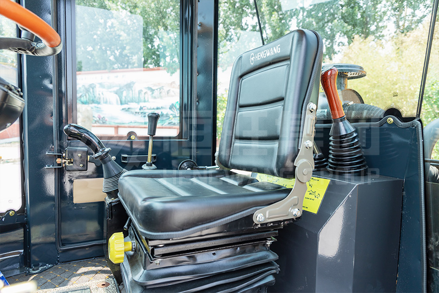The suspended shock-absorbing 360-degree rotating seat with a seat belt improves the comfort and safety of the driver.